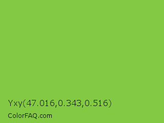 Yxy 47.016,0.343,0.516 Color is a normal green color and the nearest color is Yellow Green #9acd32. Hex code #83c944 and RGB value is rgb(131,201,68). In RGB color space, this color is composed of 51% red, 79% green, 27% blue, In CMYK color space, this color is composed of 35% cyan, 0% magenta, 66% yellow , 21% black , In HSL color space, this color has a hue angle of 92° , 55% saturation and 53% lightness.