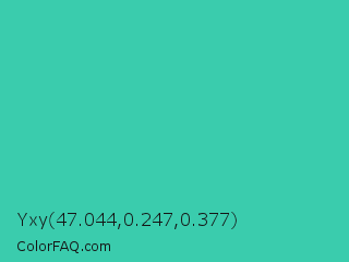 Yxy 47.044,0.247,0.377 Color is a normal cyan color and the nearest color is Puerto Rico #3fc1aa. Hex code #3accad and RGB value is rgb(58,204,173). In RGB color space, this color is composed of 23% red, 80% green, 68% blue, In CMYK color space, this color is composed of 72% cyan, 0% magenta, 15% yellow , 20% black , In HSL color space, this color has a hue angle of 167° , 59% saturation and 51% lightness.