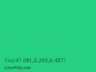 Yxy 47.081,0.265,0.457 Color is a normal green color and the nearest color is Shamrock #33cc99. Hex code #25d082 and RGB value is rgb(37,208,130). In RGB color space, this color is composed of 15% red, 82% green, 51% blue, In CMYK color space, this color is composed of 82% cyan, 0% magenta, 38% yellow , 18% black , In HSL color space, this color has a hue angle of 153° , 70% saturation and 48% lightness.