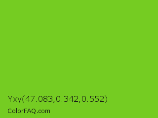 Yxy 47.083,0.342,0.552 Color is a normal green color and the nearest color is Lima #76bd17. Hex code #75cc22 and RGB value is rgb(117,204,34). In RGB color space, this color is composed of 46% red, 80% green, 13% blue, In CMYK color space, this color is composed of 43% cyan, 0% magenta, 83% yellow , 20% black , In HSL color space, this color has a hue angle of 91° , 71% saturation and 47% lightness.