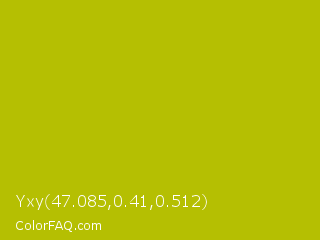 Yxy 47.085,0.41,0.512 Color is a normal yellow color and the nearest color is La Rioja #b3c110. Hex code #b5bf02 and RGB value is rgb(181,191,2). In RGB color space, this color is composed of 71% red, 75% green, 1% blue, In CMYK color space, this color is composed of 5% cyan, 0% magenta, 99% yellow , 25% black , In HSL color space, this color has a hue angle of 63° , 98% saturation and 38% lightness.
