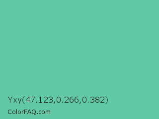 Yxy 47.123,0.266,0.382 Color is a normal green color and the nearest color is Medium Aquamarine #66ddaa. Hex code #62c9a6 and RGB value is rgb(98,201,166). In RGB color space, this color is composed of 38% red, 79% green, 65% blue, In CMYK color space, this color is composed of 51% cyan, 0% magenta, 17% yellow , 21% black , In HSL color space, this color has a hue angle of 160° , 49% saturation and 59% lightness.