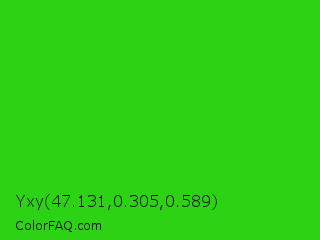 Yxy 47.131,0.305,0.589 Color is a normal green color and the nearest color is Harlequin Green #46cb18. Hex code #2bd314 and RGB value is rgb(43,211,20). In RGB color space, this color is composed of 17% red, 83% green, 8% blue, In CMYK color space, this color is composed of 80% cyan, 0% magenta, 91% yellow , 17% black , In HSL color space, this color has a hue angle of 113° , 83% saturation and 45% lightness.