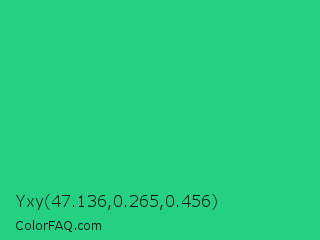 Yxy 47.136,0.265,0.456 Color is a normal green color and the nearest color is Shamrock #33cc99. Hex code #26d082 and RGB value is rgb(38,208,130). In RGB color space, this color is composed of 15% red, 82% green, 51% blue, In CMYK color space, this color is composed of 82% cyan, 0% magenta, 38% yellow , 18% black , In HSL color space, this color has a hue angle of 152° , 69% saturation and 48% lightness.