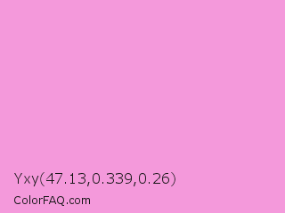 Yxy 47.13,0.339,0.26 Color is a light magenta color and the nearest color is Lavender Rose #fba0e3. Hex code #f499db and RGB value is rgb(244,153,219). In RGB color space, this color is composed of 96% red, 60% green, 86% blue, In CMYK color space, this color is composed of 0% cyan, 37% magenta, 10% yellow , 4% black , In HSL color space, this color has a hue angle of 316° , 81% saturation and 78% lightness.