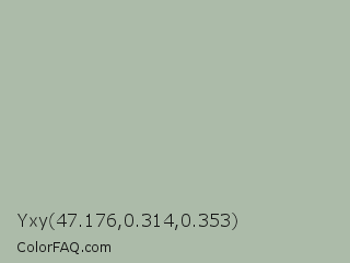 Yxy 47.176,0.314,0.353 Color is a light green color and the nearest color is Norway #a8bd9f. Hex code #acbba9 and RGB value is rgb(172,187,169). In RGB color space, this color is composed of 67% red, 73% green, 66% blue, In CMYK color space, this color is composed of 8% cyan, 0% magenta, 10% yellow , 27% black , In HSL color space, this color has a hue angle of 110° , 12% saturation and 70% lightness.