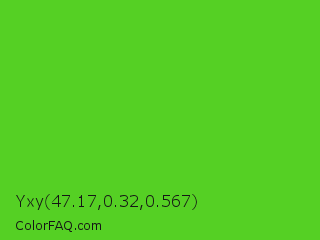 Yxy 47.17,0.32,0.567 Color is a normal green color and the nearest color is Harlequin Green #46cb18. Hex code #55d024 and RGB value is rgb(85,208,36). In RGB color space, this color is composed of 33% red, 82% green, 14% blue, In CMYK color space, this color is composed of 59% cyan, 0% magenta, 83% yellow , 18% black , In HSL color space, this color has a hue angle of 103° , 70% saturation and 48% lightness.