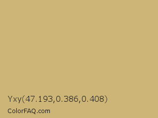 Yxy 47.193,0.386,0.408 Color is a light orange color and the nearest color is Light French Beige #c8ad7f. Hex code #ccb576 and RGB value is rgb(204,181,118). In RGB color space, this color is composed of 80% red, 71% green, 46% blue, In CMYK color space, this color is composed of 0% cyan, 11% magenta, 42% yellow , 20% black , In HSL color space, this color has a hue angle of 44° , 46% saturation and 63% lightness.