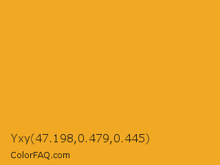 Yxy 47.198,0.479,0.445 Color is a normal orange color and the nearest color is Fuel Yellow #eca927. Hex code #f1a923 and RGB value is rgb(241,169,35). In RGB color space, this color is composed of 95% red, 66% green, 14% blue, In CMYK color space, this color is composed of 0% cyan, 30% magenta, 85% yellow , 5% black , In HSL color space, this color has a hue angle of 39° , 88% saturation and 54% lightness.
