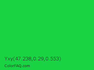 Yxy 47.238,0.29,0.553 Color is a normal green color and the nearest color is Malachite #0bda51. Hex code #19d345 and RGB value is rgb(25,211,69). In RGB color space, this color is composed of 10% red, 83% green, 27% blue, In CMYK color space, this color is composed of 88% cyan, 0% magenta, 67% yellow , 17% black , In HSL color space, this color has a hue angle of 134° , 79% saturation and 46% lightness.