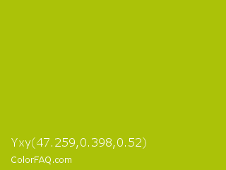 Yxy 47.259,0.398,0.52 Color is a normal yellow color and the nearest color is Citrus #a1c50a. Hex code #abc208 and RGB value is rgb(171,194,8). In RGB color space, this color is composed of 67% red, 76% green, 3% blue, In CMYK color space, this color is composed of 12% cyan, 0% magenta, 96% yellow , 24% black , In HSL color space, this color has a hue angle of 67° , 92% saturation and 40% lightness.