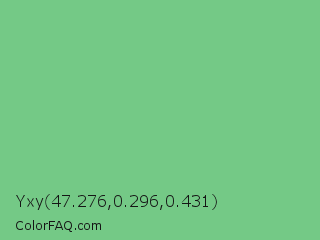 Yxy 47.276,0.296,0.431 Color is a light green color and the nearest color is De York #7ac488. Hex code #74c986 and RGB value is rgb(116,201,134). In RGB color space, this color is composed of 45% red, 79% green, 53% blue, In CMYK color space, this color is composed of 42% cyan, 0% magenta, 33% yellow , 21% black , In HSL color space, this color has a hue angle of 133° , 44% saturation and 62% lightness.