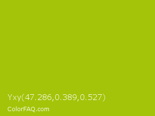 Yxy 47.286,0.389,0.527 Color is a normal lime color and the nearest color is Citrus #a1c50a. Hex code #a3c409 and RGB value is rgb(163,196,9). In RGB color space, this color is composed of 64% red, 77% green, 4% blue, In CMYK color space, this color is composed of 17% cyan, 0% magenta, 95% yellow , 23% black , In HSL color space, this color has a hue angle of 71° , 91% saturation and 40% lightness.