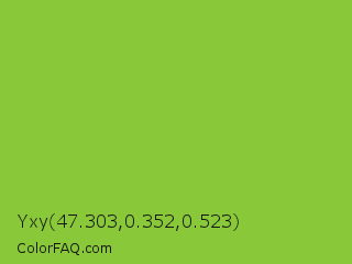 Yxy 47.303,0.352,0.523 Color is a normal green color and the nearest color is Yellow Green #9acd32. Hex code #89c939 and RGB value is rgb(137,201,57). In RGB color space, this color is composed of 54% red, 79% green, 22% blue, In CMYK color space, this color is composed of 32% cyan, 0% magenta, 72% yellow , 21% black , In HSL color space, this color has a hue angle of 87° , 57% saturation and 51% lightness.