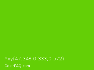 Yxy 47.348,0.333,0.572 Color is a normal green color and the nearest color is Lima #76bd17. Hex code #64cf06 and RGB value is rgb(100,207,6). In RGB color space, this color is composed of 39% red, 81% green, 2% blue, In CMYK color space, this color is composed of 52% cyan, 0% magenta, 97% yellow , 19% black , In HSL color space, this color has a hue angle of 92° , 94% saturation and 42% lightness.