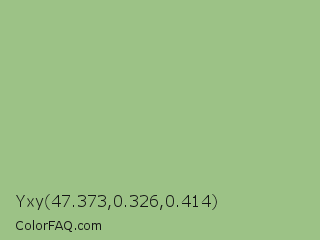 Yxy 47.373,0.326,0.414 Color is a light green color and the nearest color is Dark Sea Green #8fbc8f. Hex code #9cc286 and RGB value is rgb(156,194,134). In RGB color space, this color is composed of 61% red, 76% green, 53% blue, In CMYK color space, this color is composed of 20% cyan, 0% magenta, 31% yellow , 24% black , In HSL color space, this color has a hue angle of 98° , 33% saturation and 64% lightness.