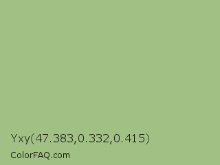 Yxy 47.383,0.332,0.415 Color is a light green color and the nearest color is Swamp Green #acb78e. Hex code #a1c184 and RGB value is rgb(161,193,132). In RGB color space, this color is composed of 63% red, 76% green, 52% blue, In CMYK color space, this color is composed of 17% cyan, 0% magenta, 32% yellow , 24% black , In HSL color space, this color has a hue angle of 91° , 33% saturation and 64% lightness.