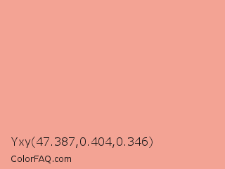 Yxy 47.387,0.404,0.346 Color is a light red color and the nearest color is Mona Lisa #ffa194. Hex code #f3a394 and RGB value is rgb(243,163,148). In RGB color space, this color is composed of 95% red, 64% green, 58% blue, In CMYK color space, this color is composed of 0% cyan, 33% magenta, 39% yellow , 5% black , In HSL color space, this color has a hue angle of 9° , 80% saturation and 77% lightness.
