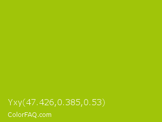 Yxy 47.426,0.385,0.53 Color is a normal lime color and the nearest color is Citrus #a1c50a. Hex code #a0c509 and RGB value is rgb(160,197,9). In RGB color space, this color is composed of 63% red, 77% green, 4% blue, In CMYK color space, this color is composed of 19% cyan, 0% magenta, 95% yellow , 23% black , In HSL color space, this color has a hue angle of 72° , 91% saturation and 40% lightness.