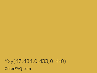 Yxy 47.434,0.433,0.448 Color is a normal orange color and the nearest color is Anzac #e0b646. Hex code #d9b346 and RGB value is rgb(217,179,70). In RGB color space, this color is composed of 85% red, 70% green, 27% blue, In CMYK color space, this color is composed of 0% cyan, 18% magenta, 68% yellow , 15% black , In HSL color space, this color has a hue angle of 44° , 66% saturation and 56% lightness.