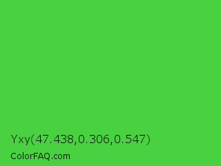 Yxy 47.438,0.306,0.547 Color is a normal green color and the nearest color is Lime Green #32cd32. Hex code #49d141 and RGB value is rgb(73,209,65). In RGB color space, this color is composed of 29% red, 82% green, 25% blue, In CMYK color space, this color is composed of 65% cyan, 0% magenta, 69% yellow , 18% black , In HSL color space, this color has a hue angle of 117° , 61% saturation and 54% lightness.