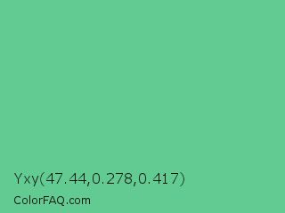 Yxy 47.44,0.278,0.417 Color is a normal green color and the nearest color is Silver Tree #66b58f. Hex code #62cb92 and RGB value is rgb(98,203,146). In RGB color space, this color is composed of 38% red, 80% green, 57% blue, In CMYK color space, this color is composed of 52% cyan, 0% magenta, 28% yellow , 20% black , In HSL color space, this color has a hue angle of 147° , 50% saturation and 59% lightness.