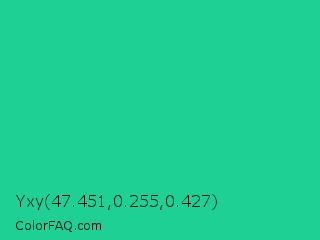 Yxy 47.451,0.255,0.427 Color is a normal green color and the nearest color is Shamrock #33cc99. Hex code #1ed093 and RGB value is rgb(30,208,147). In RGB color space, this color is composed of 12% red, 82% green, 58% blue, In CMYK color space, this color is composed of 86% cyan, 0% magenta, 29% yellow , 18% black , In HSL color space, this color has a hue angle of 159° , 75% saturation and 47% lightness.