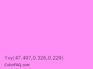 Yxy 47.497,0.326,0.229 Color is a light magenta color and the nearest color is Light Fuchsia Pink #f984ef. Hex code #ff8ff5 and RGB value is rgb(255,143,245). In RGB color space, this color is composed of 100% red, 56% green, 96% blue, In CMYK color space, this color is composed of 0% cyan, 44% magenta, 4% yellow , 0% black , In HSL color space, this color has a hue angle of 305° , 100% saturation and 78% lightness.