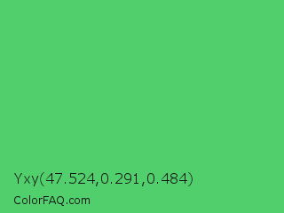 Yxy 47.524,0.291,0.484 Color is a normal green color and the nearest color is Emerald #50c878. Hex code #52cf6d and RGB value is rgb(82,207,109). In RGB color space, this color is composed of 32% red, 81% green, 43% blue, In CMYK color space, this color is composed of 60% cyan, 0% magenta, 47% yellow , 19% black , In HSL color space, this color has a hue angle of 133° , 57% saturation and 57% lightness.
