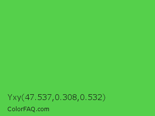Yxy 47.537,0.308,0.532 Color is a normal green color and the nearest color is Mantis #74c365. Hex code #55d04b and RGB value is rgb(85,208,75). In RGB color space, this color is composed of 33% red, 82% green, 29% blue, In CMYK color space, this color is composed of 59% cyan, 0% magenta, 64% yellow , 18% black , In HSL color space, this color has a hue angle of 115° , 59% saturation and 55% lightness.