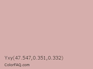 Yxy 47.547,0.351,0.332 Color is a light red color and the nearest color is Pale Chestnut #ddadaf. Hex code #d6aeac and RGB value is rgb(214,174,172). In RGB color space, this color is composed of 84% red, 68% green, 67% blue, In CMYK color space, this color is composed of 0% cyan, 19% magenta, 20% yellow , 16% black , In HSL color space, this color has a hue angle of 3° , 34% saturation and 76% lightness.