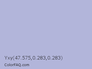Yxy 47.575,0.283,0.283 Color is a light blue color and the nearest color is Pigeon Post #afbdd9. Hex code #b2b5da and RGB value is rgb(178,181,218). In RGB color space, this color is composed of 70% red, 71% green, 85% blue, In CMYK color space, this color is composed of 18% cyan, 17% magenta, 0% yellow , 15% black , In HSL color space, this color has a hue angle of 236° , 35% saturation and 78% lightness.