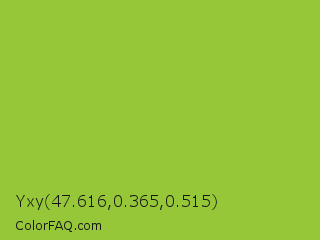Yxy 47.616,0.365,0.515 Color is a normal green color and the nearest color is Yellow Green #9acd32. Hex code #96c738 and RGB value is rgb(150,199,56). In RGB color space, this color is composed of 59% red, 78% green, 22% blue, In CMYK color space, this color is composed of 25% cyan, 0% magenta, 72% yellow , 22% black , In HSL color space, this color has a hue angle of 81° , 56% saturation and 50% lightness.
