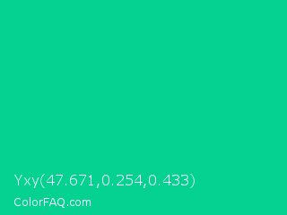Yxy 47.671,0.254,0.433 Color is a normal green color and the nearest color is Caribbean Green #00cc99. Hex code #05d191 and RGB value is rgb(5,209,145). In RGB color space, this color is composed of 2% red, 82% green, 57% blue, In CMYK color space, this color is composed of 98% cyan, 0% magenta, 31% yellow , 18% black , In HSL color space, this color has a hue angle of 161° , 95% saturation and 42% lightness.