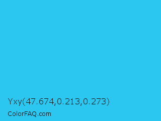 Yxy 47.674,0.213,0.273 Color is a normal cyan color and the nearest color is Scooter #2ebfd4. Hex code #2cc7f0 and RGB value is rgb(44,199,240). In RGB color space, this color is composed of 17% red, 78% green, 94% blue, In CMYK color space, this color is composed of 82% cyan, 17% magenta, 0% yellow , 6% black , In HSL color space, this color has a hue angle of 193° , 87% saturation and 56% lightness.