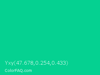 Yxy 47.678,0.254,0.433 Color is a normal green color and the nearest color is Caribbean Green #00cc99. Hex code #05d191 and RGB value is rgb(5,209,145). In RGB color space, this color is composed of 2% red, 82% green, 57% blue, In CMYK color space, this color is composed of 98% cyan, 0% magenta, 31% yellow , 18% black , In HSL color space, this color has a hue angle of 161° , 95% saturation and 42% lightness.