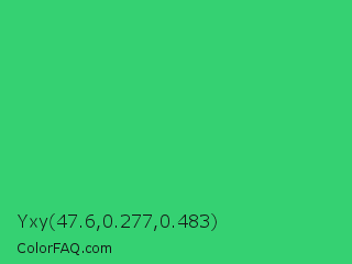 Yxy 47.6,0.277,0.483 Color is a normal green color and the nearest color is UFO Green #3cd070. Hex code #35d172 and RGB value is rgb(53,209,114). In RGB color space, this color is composed of 21% red, 82% green, 45% blue, In CMYK color space, this color is composed of 75% cyan, 0% magenta, 45% yellow , 18% black , In HSL color space, this color has a hue angle of 143° , 63% saturation and 51% lightness.