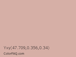 Yxy 47.709,0.356,0.34 Color is a light red color and the nearest color is Clam Shell #d4b6af. Hex code #d6afa6 and RGB value is rgb(214,175,166). In RGB color space, this color is composed of 84% red, 69% green, 65% blue, In CMYK color space, this color is composed of 0% cyan, 18% magenta, 22% yellow , 16% black , In HSL color space, this color has a hue angle of 11° , 37% saturation and 75% lightness.