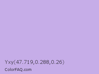 Yxy 47.719,0.288,0.26 Color is a light violet color and the nearest color is Tropical Violet #cda4de. Hex code #c6ade8 and RGB value is rgb(198,173,232). In RGB color space, this color is composed of 78% red, 68% green, 91% blue, In CMYK color space, this color is composed of 15% cyan, 25% magenta, 0% yellow , 9% black , In HSL color space, this color has a hue angle of 265° , 56% saturation and 79% lightness.