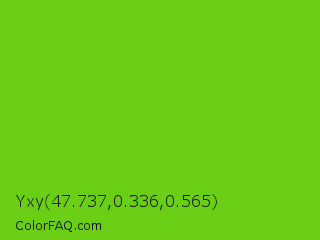 Yxy 47.737,0.336,0.565 Color is a normal green color and the nearest color is Lima #76bd17. Hex code #6acf14 and RGB value is rgb(106,207,20). In RGB color space, this color is composed of 42% red, 81% green, 8% blue, In CMYK color space, this color is composed of 49% cyan, 0% magenta, 90% yellow , 19% black , In HSL color space, this color has a hue angle of 92° , 82% saturation and 45% lightness.