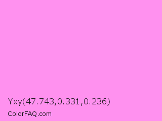 Yxy 47.743,0.331,0.236 Color is a light magenta color and the nearest color is Light Fuchsia Pink #f984ef. Hex code #ff91ef and RGB value is rgb(255,145,239). In RGB color space, this color is composed of 100% red, 57% green, 94% blue, In CMYK color space, this color is composed of 0% cyan, 43% magenta, 6% yellow , 0% black , In HSL color space, this color has a hue angle of 309° , 100% saturation and 78% lightness.