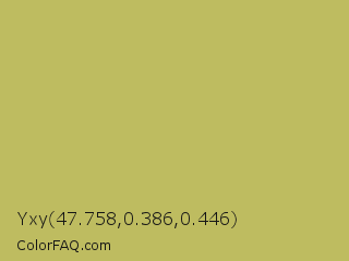 Yxy 47.758,0.386,0.446 Color is a normal yellow color and the nearest color is Celery #b8c25d. Hex code #bebc60 and RGB value is rgb(190,188,96). In RGB color space, this color is composed of 75% red, 74% green, 38% blue, In CMYK color space, this color is composed of 0% cyan, 1% magenta, 49% yellow , 25% black , In HSL color space, this color has a hue angle of 59° , 42% saturation and 56% lightness.