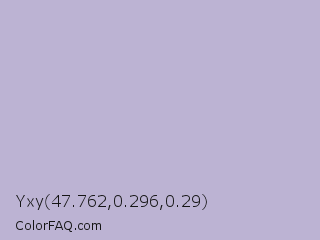Yxy 47.762,0.296,0.29 Color is a light indigo color and the nearest color is Lavender Gray #bdbbd7. Hex code #bcb3d3 and RGB value is rgb(188,179,211). In RGB color space, this color is composed of 74% red, 70% green, 83% blue, In CMYK color space, this color is composed of 11% cyan, 15% magenta, 0% yellow , 17% black , In HSL color space, this color has a hue angle of 257° , 27% saturation and 76% lightness.
