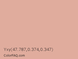 Yxy 47.787,0.374,0.347 Color is a light red color and the nearest color is Pastel Pink #dea5a4. Hex code #e0ac9d and RGB value is rgb(224,172,157). In RGB color space, this color is composed of 88% red, 67% green, 62% blue, In CMYK color space, this color is composed of 0% cyan, 23% magenta, 30% yellow , 12% black , In HSL color space, this color has a hue angle of 13° , 52% saturation and 75% lightness.