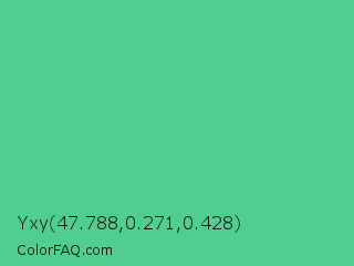 Yxy 47.788,0.271,0.428 Color is a normal green color and the nearest color is Ocean Green #48bf91. Hex code #4fce8f and RGB value is rgb(79,206,143). In RGB color space, this color is composed of 31% red, 81% green, 56% blue, In CMYK color space, this color is composed of 62% cyan, 0% magenta, 31% yellow , 19% black , In HSL color space, this color has a hue angle of 150° , 56% saturation and 56% lightness.