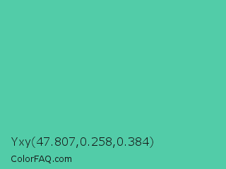 Yxy 47.807,0.258,0.384 Color is a normal green color and the nearest color is Eucalyptus #44d7a8. Hex code #52cca8 and RGB value is rgb(82,204,168). In RGB color space, this color is composed of 32% red, 80% green, 66% blue, In CMYK color space, this color is composed of 60% cyan, 0% magenta, 18% yellow , 20% black , In HSL color space, this color has a hue angle of 162° , 54% saturation and 56% lightness.