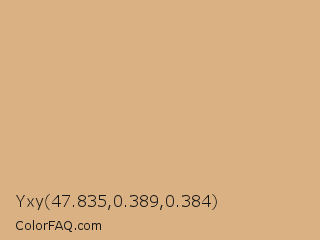 Yxy 47.835,0.389,0.384 Color is a light orange color and the nearest color is Burlywood #deb887. Hex code #d9b183 and RGB value is rgb(217,177,131). In RGB color space, this color is composed of 85% red, 69% green, 51% blue, In CMYK color space, this color is composed of 0% cyan, 18% magenta, 40% yellow , 15% black , In HSL color space, this color has a hue angle of 32° , 53% saturation and 68% lightness.