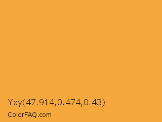 Yxy 47.914,0.474,0.43 Color is a normal orange color and the nearest color is Yellow Orange #ffae42. Hex code #f6a83c and RGB value is rgb(246,168,60). In RGB color space, this color is composed of 96% red, 66% green, 24% blue, In CMYK color space, this color is composed of 0% cyan, 32% magenta, 76% yellow , 4% black , In HSL color space, this color has a hue angle of 35° , 91% saturation and 60% lightness.