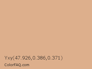 Yxy 47.926,0.386,0.371 Color is a light orange color and the nearest color is Tumbleweed #deaa88. Hex code #ddaf8c and RGB value is rgb(221,175,140). In RGB color space, this color is composed of 87% red, 69% green, 55% blue, In CMYK color space, this color is composed of 0% cyan, 21% magenta, 37% yellow , 13% black , In HSL color space, this color has a hue angle of 26° , 54% saturation and 71% lightness.