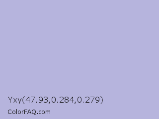 Yxy 47.93,0.284,0.279 Color is a light indigo color and the nearest color is Lavender Gray #bdbbd7. Hex code #b6b4dd and RGB value is rgb(182,180,221). In RGB color space, this color is composed of 71% red, 71% green, 87% blue, In CMYK color space, this color is composed of 18% cyan, 19% magenta, 0% yellow , 13% black , In HSL color space, this color has a hue angle of 243° , 38% saturation and 79% lightness.